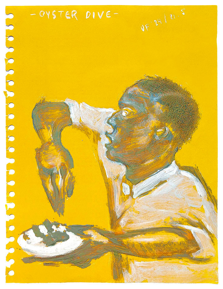 Oil paint and pencil on yellow found paper - 21 x 14 cm. - 2024